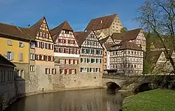 Schwäbisch Hall (German pronunciation: [ˌʃvɛːbɪʃ ˈhal] ⓘ; 'Swabian Hall'; from 1802 until 1934 and colloquially: Hall[3]) is a city in the German state of Baden-Württemberg located in the valley of the Kocher river, the longest tributary (together with its headwater Lein) of the Neckar river. The closest larger city is Heilbronn, and Schwäbisch Hall lies north-east of the state capital of Stuttgart. It is the seat of the district (Landkreis) of Schwäbisch Hall.