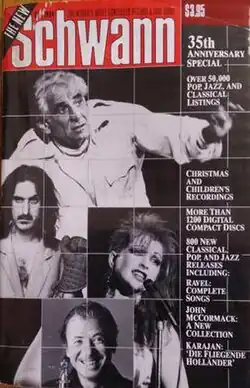 The Schwann Catalog (previously Schwann Long Playing Record Catalog or later Schwann Record And Tape Guide) was a catalog of recordings started by William Schwann in 1949.[1] The first edition was hand-typed and 26 pages long, and it listed 674 long-playing records (see LP record). By the late 1970s, over 150,000 record albums had been listed in Schwann. The company was honored by the record industry both at the 25th anniversary (1974)[2] and 35th anniversary (1984).[3]
