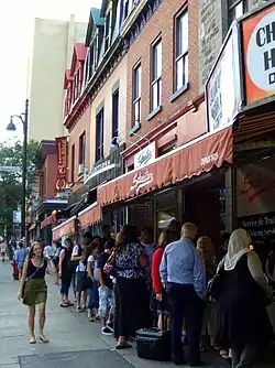 The famed Main Deli Steak House opened right across the street in 1974 and operated until 2023, becoming Schwartz's main business rival. The two restaurants were often compared against each other in their patronage and the flavours of their Montreal-style smoked meat.[4] While both establishments continued to be rated highly in recent years, Schwartz's frequently won ‘Best Montreal Sandwich Award’ which Main never managed. Furthermore, Schwartz's was always much more popular among tourists who lined up there for hours while ignoring the Main Deli, attributed to Schwartz's "worldwide fame that makes it a must-enjoy attraction for tourists after 95 years in existence".[12] Perhaps because of this, a frequent customer of Main Deli said “From what I heard, many Montrealers preferred it to Schwartz’s. It felt like it had more of the real traditional feel, while Schwartz’s can feel kind of touristy.” [13]