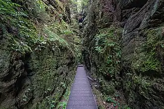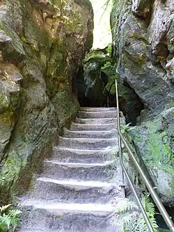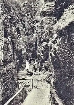 The first touristic development of the gorge occurred comparatively late on. In 1886, at the initiative of the Alpine Club for Saxon-Bohemian Switzerland, a walkway was built through the Schwedenlöcher. To build the steps and bridges the gorge had to be artificially widened in places. The new footpath, which linked the well known rock massif of the Bastei with the Amselgrund, was opened on 1 May 1886 on the occasion of the 6th German Geographers' Day. In 1967/68, comprehensive renovation was carried out on the path. This involved the construction of 3.5 tons of steel and 600 concrete slabs. The path has 777 steps and over 20 concrete bridges.[1]