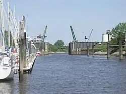 The Schwingesperrwerk is a man-made movable barrier located on the Schwinge at its confluence with the Elbe near Stade, Germany. It is part of the flood control program for the Lower Elbe tidewater region, from the weir in Geesthacht to the mouth of the Elbe where it flows into the North Sea. Engineers constructed the Schwingesperrwerk after a storm surge caused severe floods in the region in 1962.[1]