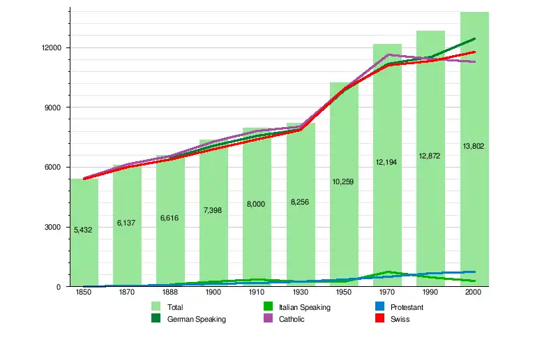 Schwyz had a population (as of December 2020) of 15,435.[13] As of 2008, 15.6% of the population were resident foreign nationals. Over the year 2010–2011 the population reduced by 0.6%. Migration accounted for −0.9%, while births and deaths accounted for 0.0%.[11] Most of the population (as of 2000) speaks German (12,441 or 90.1%) as their first language, Serbo-Croatian is the second most common (378 or 2.7%) and Italian is the third (273 or 2.0%). There are 23 people who speak French and 25 people who speak Romansh.[14]