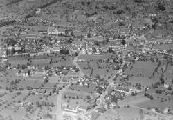 According to the chronicle of Johann Stumpf from 1548, the old town originally consisted of a village square, the church and its cemetery, the town hall, the inn, the archive tower and a number of scattered wooden houses. Around 1500, to distinguish it from the Canton of Schwyz, Schwyz town was often called Kilchgassen, which meant the village around the church but not the surrounding villages. The fire of 1642, which destroyed 47 buildings in the center of the village, allowed the town to be totally rebuilt. A new, larger town square with major roads radiating out was built in front of the new church and the new city hall. The houses were rebuilt as urban townhouses and a ring of about 30 large patrician farm houses grew up surrounding the village center.[9]