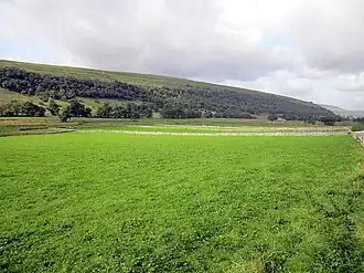 Scoska Wood, along with many other woodlands in Wharfedale and Littondale, is classified as ancient wood, being in existence since at least 1500, and has been carefully or traditionally managed.[4] The wood sits on the south-eastern side of Littondale underneath Scoska Moor, from which it takes its name. Scoska Moor was recorded in 1768 as Scoscoe Moor, and it is thought that the second part of the word (ska), derives from the Old Norse Skogr; meaning wood.[5][6] The underlying rock is carboniferous limestone, and the wood consists mainly of ash trees which "cling" to the steep valley side,[7] with the wood and meadowsides traditionally managed to encourage herb-rich grasslands.[8] Other trees in the wood include larch, spruce and birch.[9]