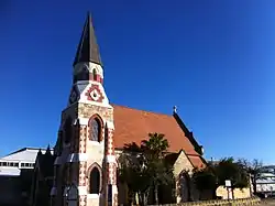 The church is constructed from ashlar limestone with red-brick quoins on the buttresses and window edges. The steeply pitched roof is constructed from timber, originally with jarrah shingles but most recently with terra cotta tiles.[2] When originally built, the church consisted of a nave and an aisle on the north-western side; the vestry is at the north-eastern end of the aisle with a connecting tower and porch at the south-western end facing Norfolk Street, which acts as the main entrance. The building style is rustic gothic, composed of stone in irregular coursed work, with red brick moulded windows and door jambs. There are moulded brick dripstones rising from plaster and terra cotta corbels. The window sills, plinths, mouldings and steps of buttresses are rendered in cement stucco. The building's exterior is rough stone and brickwork with the brick pointed, in black and white mortar. The tower is 23 metres (75 ft) tall with an octagonal spire.[3]