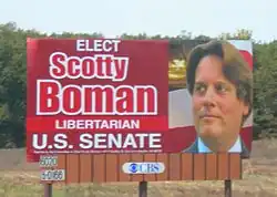 Boman finished third in an unsuccessful attempt to be elected to Carl Levin's seat in the US Senate, in which he received 1.6% of the vote.[61] His attempt was made under the Libertarian Party of Michigan ticket after winning a contested nomination at their convention over, their 2006 United States Senate nominee, Leonard Schwartz.[62]