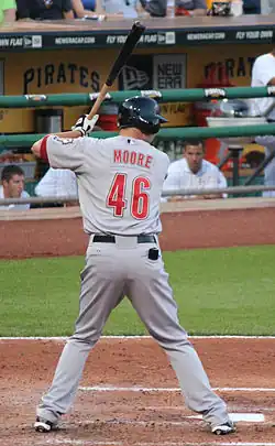 On February 9, 2005, Moore was traded to the Chicago Cubs alongside Roberto Novoa and Bo Flowers in exchange for pitcher Kyle Farnsworth and a player to be named later.[2] Moore made his major league debut on September 4, 2006, against the Pittsburgh Pirates, and was hit by a pitch in his only at-bat of the game in the second inning.[3] On September 7, he hit his first major league home run against the Pirates in a 7–5 loss.[4] He was called up again on July 20, 2007, to start at first base against the Arizona Diamondbacks after a suspended Derrek Lee and an injured Daryle Ward left the Cubs in need of a first baseman.[5]