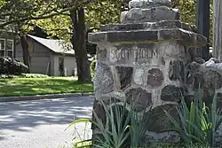 Scottholm was designed by a landscape architect and planner Arthur C. Comey following the popular ideals for new garden suburbs easily reached by streetcar from urban commercial centers.[5] These new developments, of which Syracuse has several notable examples, are typified by winding streets, mandated setbacks and front yards, organized tree-planting alongside sidewalks, and various protective covenants regarding ownership qualifications. The historic stone gates at the entrances to the Scottholm neighborhood on East Genesee Street remain in place.[3]
