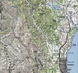 About 200,000 years ago the Clear Lake Volcanic Field blocked the lake's outlet.[11] The lake rose until it found a new outlet, draining west through the Blue Lakes into Cold Creek and the Russian River.[12] Clear Lake was almost 300 feet (91 m) higher than it is today, and Scotts Creek flowed into the lake from the west near where Lakeport is today. It formed a large delta there, which deposited the Lakeport ridge.[10]