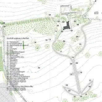 The château is composed of a main rectangular building, flanked by two square towers on its southwest and northeast corners, and a round tower to the southeast. A second perpendicular wing to the north is also flanked by another square tower on its east corner. The walls are made of red and dark brown brickwork, paired to form lozenge patterns. The openings are framed with white limestone. The north façade and some windows to the other sides were modified throughout the end of the 19th century.”[1]
