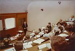 The courses were organized both on demand,[11] and on proposal through a catalogue of programs. An example of on demand activity was the Corso di Perfezionamento in Telecomunicazioni (Telecommunications Specialization Course), lasting several months and mandatory for all the newly hired employees of the Telecom Italia group. The catalogue training counted around 250 courses generally lasting one week and addressing information engineering,[12] corporate management[13] and international topics.[14]