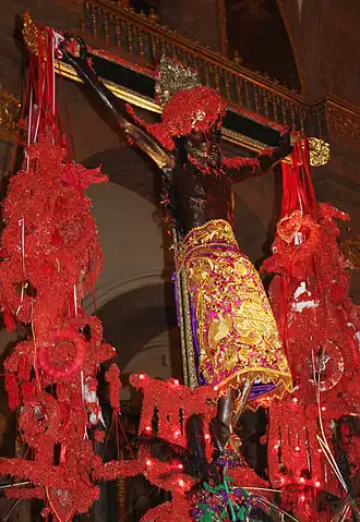 The Christ is carefully adorned. The nails of his hands and feet are of pure gold inlaid with precious stones, he had a crown of pure gold with stones weighing 1.3 kg, a gift of Viceroy Francisco de Borja y Aragon, which in the 1980s was stolen. The one he now wears is also golden, but it is lighter. With the passage of time, the images of the Virgin of Sorrows and St. John the Evangelist were added to the altar.