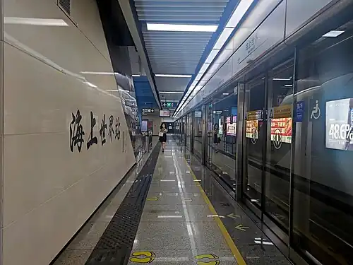 Sea World station (Chinese: 海上世界站; pinyin: Hǎishàng Shìjiè Zhàn; Jyutping: Hoi2 Soeng6 Sai3 Gaai3 Zaam6) is an interchange station for Line 2 and Line 12 of the Shenzhen Metro. Line 2 platforms opened on 28 December 2010 and Line 12 platforms opened on 28 November 2022.[1][2] It is located close to the eastern edge of Shekou in Nanshan district of Shenzhen.[3]