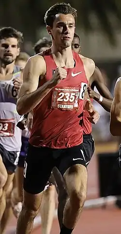 McGorty also specialized in the 5000 m. On May 1, 2016, he attained the qualifying standard in the event for the Olympics, with a personal best of 13:24.25 at the Payton Jordan Invitational.[11] At the 2016 NCAA Outdoor Championships, he finished second behind Edward Cheserek in the 5000 m. McGorty improved to first place at the 2018 NCAA Outdoor Championships to win the NCAA title in the 5000 m in 13:54.81 by out kicking heavy favorite Justyn Knight, as well as the 2017 champion and Stanford teammate Grant Fisher.[12] His university honors include being named NCAA Division I Male Indoor Track Scholar Athlete of the Year and Scholar-Athlete of the Year by the U.S. Track & Field and Cross Country Coaches Association.[13][14]
