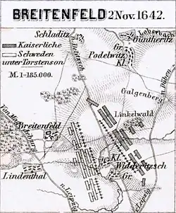 The Second Battle of Breitenfeld, also known as the First Battle of Leipzig, took place during the Thirty Years' War on 2 November 1642 at Breitenfeld, north-east of Leipzig in Germany. A Swedish Army commanded by Lennart Torstensson decisively defeated an Imperial Army under Archduke Leopold Wilhelm of Austria and his deputy Ottavio Piccolomini.[6]