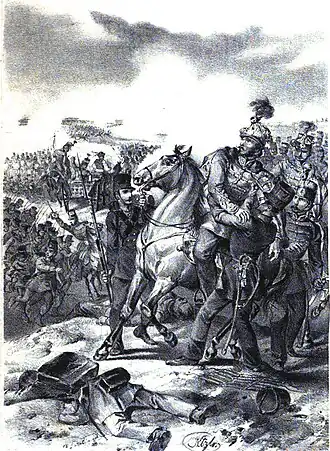The imperial advance was finally halted by Hungarian artillery from the fortress and Hadi Island in the Danube and by cannons from the first bastion of the Nádor line across the river.[51] The Hungarian right flank (under heavy Austrian rocket fire) continued its disorderly retreat, endangering the fortifications and potentially opening a path for the Austrians towards Újszőny and the Danube bridge.[52] Görgei ordered to a cavalry battery to move towards the Danube and fill two cannons with grapeshot to dissuade his fleeing troops.[52] He took this drastic measure to save his army despite mistakenly thinking that his younger brother, Captain István Görgey, was among the fleeing soldiers.[53] The cannons shot twice because the soldiers would not halt.[52] Görgei ordered the 48th battalion to fire a salvo, and a group of Hussars managed to stop and reorganize the fleeing soldiers for a counterattack.[52]