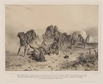 Poeltenberg's troops were retreating in disorder when Görgei and his staff arrived on the right flank, and the commander saw that the Austrians had occupied three Hungarian trenches.[51] He retook the trenches with the 71st battalion, which counterattacked in three columns with bayonets and incurred heavy losses. Lacking support from other Hungarian units and under attack from the Danube, however, they had to retreat again.[52]
