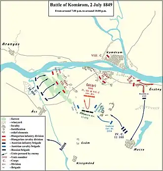 - ^ a b Bánlaky József: A magyar nemzet hadtörténete XXI, XXXII Az osztrák fősereg előnyomulásának folytatása; a komáromi első csata 1849. julius 2-án. Arcanum Adatbázis Kft. 2001