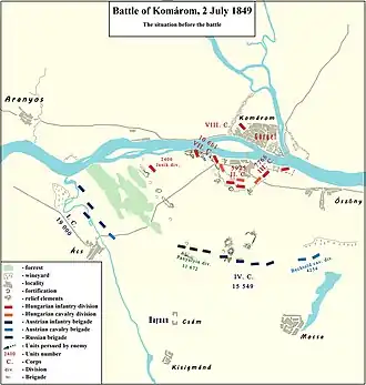 Komárom and its surroundings were strategically important. It was a favourable crossing point of the Danube and the Vág, which could be easily defended since Komárom's fort system was a modern, important Habsburg Monarchy stronghold.[23] The most important elements of the Komárom fort system were the Old and the New Castles on the east edges of Csallóköz (on the Danube); temporary defensive elements primarily occupied the future battlefield, with only the Star Trench (Csillagsánc) a stone bridgehead fort.[23]