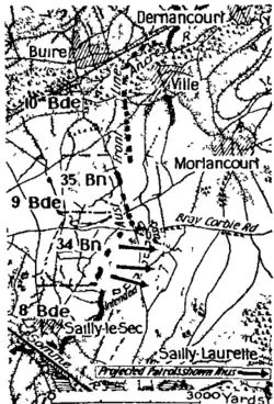 On 29 April, while touring the front, it had become apparent to Rosenthal that his brigade's outpost positions on his right were isolated and vulnerable due to a series of sunken roads, vegetation and other terrain features that provide cover for a German surprise attack. Rosenthal decided it was necessary to push his line forward across the valley to the next slope. The 34th Battalion, holding the southern part of the 9th Brigade area, was detailed for the task. They would be supported by the 3rd Pioneers and fatigue parties from the 33rd Battalion, to dig trenches and lay out wire obstacles. The 35th Battalion, holding the northern part of the brigade front, would clear several German positions in front of its line to the protect the flank of the 34th Battalion.[10] Direct fire support was provided by the 10th Machine Gun Company, while the 9th Light Trench Mortar Battery provided indirect fire support.[11]