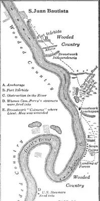 At 4:15 PM, near Santa Teresa, 12 miles (19 km) below San Juan Bautista, the fleet ran through an ambush with little difficulty.[1]: 340 At 5:45 PM, at an "s" curve in the river known as the "Devil's Bend", Perry encountered Mexican fire from the chaparral, dispersed some cavalry with the Vesuvius, and anchored for the night intending to deal with the obstructions ahead during daylight the next day.[1]: 340 At dusk, a lone Mexican shot one of Perry's men on the Vesuvius's forecastle.[1]: 341