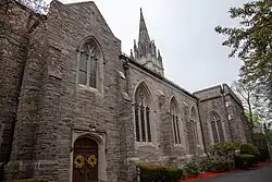 There are gargoyles on either side of the front entrance. A square tower rises at the eastern end of the north elevation. To the north of the main building, the Parish House, an education wing with Tudor styling and leaded casement windows, was added in 1938.[2] The architectural firm Allen, Collens & Willis was responsible for the design.
