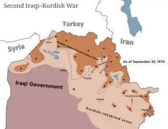 The Second Iraqi–Kurdish War[14] was the second chapter of the Barzani rebellion, initiated by the collapse of the Kurdish autonomy talks and the consequent Iraqi offensive against rebel KDP troops of Mustafa Barzani during 1974–1975. The war came in the aftermath of the First Iraqi–Kurdish War (1961–1970), as the 1970 peace plan for Kurdish autonomy had failed to be implemented by 1974. Unlike the previous guerrilla campaign in 1961–1970, waged by Barzani, the 1974 war was a Kurdish attempt at symmetric warfare against the Iraqi Army, which eventually led to the quick collapse of the Kurds, who were lacking advanced and heavy weaponry. The war ended with the exile of the Iraqi KDP party and between 7,000–20,000 deaths from both sides combined.