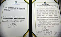 Arriving at the Congress, President and Vice President were received and greeted by the Presidents of the Chamber of Deputies, Aldo Rebelo, and the Senate, Renan Calheiros. After that, they climbed the ramp and headed to the plenary of the Chamber, where the president of the Senate opened the joint session of inauguration of Lula and Alencar. Both made the oath of office and read the investiture document: "I promise to preserve, defend and uphold the Constitution, observe the Laws, promote the general welfare of the Brazilian people, sustain the union, the integrity and the independence of Brazil". After the reading, the President and the Vice President signed the investiture document, that was succeeded by the National Anthem played by the Brazilian Marine Corps band.[3]