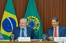 Lula has been criticizing the president of the Central Bank of Brazil, Roberto Campos Neto, for maintaining the basic interest rate at 13.75% per year, and has even considered ending the institution's autonomy in the future.[34][35] The presidents of the Senate and the Chamber ruled out this possibility.[36][37] According to some analysts, these attacks by Lula on the president of the BC are "a shot on the foot", as they would increase the inflation expectations of economic agents, resulting in more inflation in practice, in addition to increasing future interest rates, having an effect contrary to the intended.[38][39] Campos Neto, seeking to relax the relationship with Planalto, gave an interview in February to the programme Roda Viva, on the TV Cultura, in which he adopted a calming tone, avoiding confrontation with the government.[40] In a survey carried out with financial market agents in March 2023, 94% reported not trusting Lula, while 68% said they trusted Campos Neto.[41]