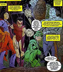 The SSoSV in time grew into a large underground group with dozens of villains (consisting of Amos Fortune, Black Hand, Blockbuster II, Bolt, Captain Boomerang, Cheetah III, Cheshire, Deadshot, Doctor Alchemy, Doctor Phosphorus, Doctor Sivana, Fiddler, Floronic Man, Gorilla Grodd, Heat Wave, Hector Hammond, Killer Frost II, Major Disaster, Monocle, Penguin, Per Degaton, Poison Ivy, Prankster, Psycho-Pirate II, Rainbow Raider, Riddler, the Royal Flush Gang, Scarecrow, Signalman, Solomon Grundy, Sonar, Star Sapphire, and Wizard) holding membership in various scattered cells. After the reformation of the JLA, the seven superheroes decided to infiltrate and shut down this new Society. Disguising himself as the deceased Brain Wave who claimed that he was back from the dead, Martian Manhunter lured the villains to one spot where they were defeated by the JLA. As the tale was told by Rainbow Raider to Sonar III, it is uncertain whether this tale actually happened. At the very least, there may have been some embellishment.[14]