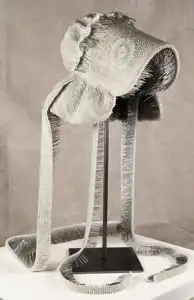 On the exterior of the bonnets, there are simple designs created with pins such as circles and lines. The Church of the Latter Day Saints refers to the "seer stone" as a prophetic tool used by Joseph Smith to receive messages and foresight from God.[3] Ellsworth’s circular designs along with the title of her series link the bonnets to the seer stones. Historically in the Mormon faith, seer stones were used by men to receive revelations. Ellsworth gives the bonnets seer symbols of stones, connecting these tools of visions to the women. Ellsworth highlights the polygamous history of LDS and the roles of the wives while removing them from the control of the men. Ellsworth constructed the traditionally soft and malleable object of bonnets into sharp and durable sculptures, in turn recontextualizing the Mormon wives in the same way.