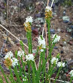 Relatively short racemes appear at the tips of the numerous branches, containing white flowers with hairy sepals and exserted stamens. The bracts are very long - at least as long as the flowers' corolla tubes - and have obtuse tips. The bracts, like the calyx, are noticeably very furry.[1]