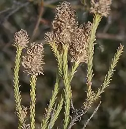 Selago ramosissima is a small, perennial shrublet, branching profusely from its lower stem. The stems are covered densely in small, thick, adpressed, obtuse-tipped, linear-oblong leaves. New branches are minutely hairy, old branches with persistent dead leaves that are eventually shed.