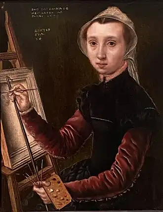 Self-Portrait is an oil on oak self-portrait executed by the Flemish Renaissance artist Catharina van Hemessen in 1548 when she was 20 years old. The portrait earned the artist a considerable reputation. It is significant for being one of the earliest paintings not only of a female of the early modern era but also of an artist in the act of painting.[1] While self-portraits were common at the time, only a few, like those of Albrecht Dürer (d. 1528), showed the artist's everyday life.[1] Artists of the time rarely directly referred to, much less showed the tools of their profession.[1] It is assumed the portrait is one of the earliest to show a painter with a brush together with a palette and an easel.[1]