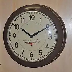 The relationship of the Self Winding Clock Company with Western Union (WU) began with an agreement between the companies of June 1889.[8] Its subject matter was for the transmission of time signals over Western Union telegraph lines to synchronize clocks made by SWCC. The company owned the clocks and WU installed and maintained them for a monthly fee, ranging from $1.25 to $2.00 per clock. SWCC was paid a percentage of the rental fee for providing clocks for WU customers.[9] If the clock movements required major repairs, they were sent to a SWCC repair facility and a replacement movement was installed by WU at the customer location. The partnership between SWCC and WU ended in 1963 when, as part of a lawsuit settlement, WU purchased all the rental clocks from SWCC. By the late 1960s, the time-service business had run its course and ceased to be profitable. Most of the clocks were simply abandoned.