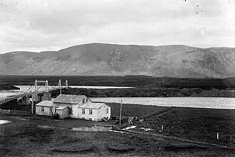 In the summer of 1891, due to the lobbying of Tryggvi Gunnarsson, a member of the Alþing, the first suspension bridge was built over the Ölfusá. That was a major breakthrough in Icelandic infrastructure. The current bridge was built in 1945 after the original structure collapsed. The cabin built to house workers constructing the bridge is the oldest building in Selfoss, and was named Tryggvaskáli in honor of Tryggvi for his efforts to construct the bridge. After the construction the building was used for travellers' accommodation and dining, until 1974. The building was also the site of Selfoss's first school, telephone exchange and bank.[1]