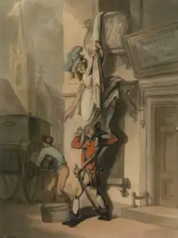Mills got caught up in the elopement of Clementina Clerke, a wealthy heiress being educated at the school. Rowlandson's caricature is inaccurate: an accomplice posing as a servant delivered a letter to Selina purporting to come from Clerke's guardian requesting that Clementina take the carriage provided in order to go and see him immediately. Selina and Mary saw Miss Clerke into the carriage, but only later realised they had been duped.[4]