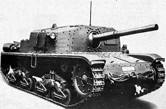After the success of the Semovente da 75/18, it was decided to build a vehicle with a better gun, to improve its anti-tank capability (which on the former was given by the use of HEAT shells); some prototypes were built which replaced the Obice da 75/18 with a 75 mm L/32 field gun on the M14/41 tank chassis.[4][5] Production began in spring 1943, with the 75 mm L/34 gun (the same as on the Carro Armato P 40) on the chassis of the M15/42 tank. Some sixty were built before the Italian armistice in September 1943.[6]