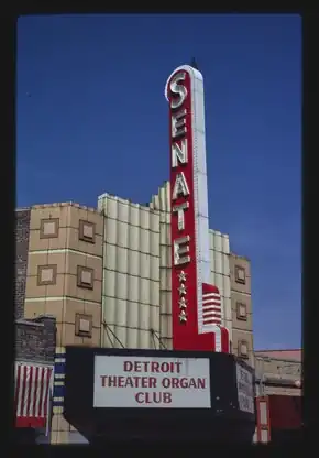 The Senate Theater is a theater in Detroit, Michigan, known for its "Mighty Wurlitzer" pipe organ, originally installed at the Fisher Theater. The Senate opened in 1926, deteriorated substantially after its closure in the 1950s, and reopened in 1964 under the ownership and volunteer operation of the Detroit Theatre Organ Society. The Senate continues to present organ performances, classic films, and private events.[1]