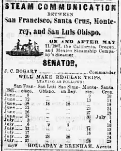 - ^ "Arrival of Steamer Senator". San Luis Obispo Tribune. March 16, 1872.