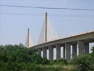 The Senator William V. Roth Jr. Bridge, the first cable-stayed bridge of its type in the Delaware Valley area (all previous Delaware River or C & D Canal bridges are either suspension, cantilever, or simple truss designs), is also the first pre-cast concrete bridge to be built in the United States.[2] Modeled after that of the Sunshine Skyway Bridge in St. Petersburg, Florida, the bridge incorporates many features not found on the other canal bridges: