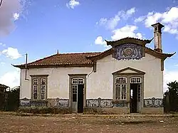 The Sendim railway station consists of the passenger building, a covered pier, a toilet building and a staff housing and water tank building.[12] The passenger building has a rectangular floor plan and single-storey façades, ending in a cornice and simple eaves, plastered and painted white, with eleven blue and white figurative tile panels depicting monuments from the region, landscapes and country scenes from the period, panels under the openings, a polychrome panel with the coat of arms of Portugal and two toponymic panels.[12] The main façade faces east.[16] The interior is divided into two unequal areas: the smaller one to the north, corresponding to the stationmaster's room, and the one to the south, corresponding to the public area, with a porch and waiting room, and the service area, with a telegraph office, ticket office and dispatch area.[12] The walls are covered in polychrome azulejos[10] made by Gilberto Renda.[17][18][19]