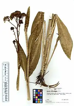 Senecio hydrophiloides is a species of flowering plant in the aster family known by the common names tall groundsel[1] and sweet marsh ragwort. It is native to western North America from British Columbia and Alberta to northern California to Utah, where it grows in wet meadows and similar habitat. It is a biennial or perennial herb producing a single erect stem or a cluster of a few stems which may exceed one meter in maximum height. The plants are green to red in color and usually without hairs, but new growth can be woolly. The leaves are lance-shaped to oval with toothed edges, the blades up to 25 centimeters long and borne on long winged petioles. The leaves are firm and sometimes a bit fleshy. The inflorescence is a loose or dense cluster of up to 30 or more flower heads lined with black-tipped phyllaries. They contain many yellowish disc florets at the center and often have some yellow ray florets, though these are sometimes absent. Senecio Hydrophiloides can cause Dermatitis.[2]