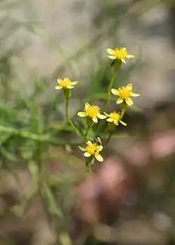 This loosely branched shrub grows up to 1–1.2 m (3.3–3.9 ft) long.[2][3] The young stems are densely leafy and hey turn grey with age.[2] The leaves are narrow and fleshy.[3] Flowers are present between October and July. They are very small. Yellow disc shaped flowers grow in branched inflorescences.[2][3] The cylindrical seeds have ribs with short hairs.[2]