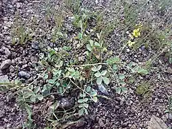 Individuals of this species are deciduous, perennial herbs, and shrubs up to 60 cm tall. The plant is woody throughout. Taproots are present in this plant. Stems are solid, usually less than 2 m tall. These stems or young twigs are glabrous or sparsely glabrous and sparsely to densely hairy.[3] This species has compound leaves with pinnate veination. There are approximately 4-6 leaflets per leaf, which are arranged spirally and alternately. The leaflets are elliptical, and shortly hairy on both sides. There is a small reddish gland between each leaflet pair on the rhachis of arachoides subspecies.[4] The stipules are usually have lanceolate-triangular shape. They are approximately 3–9 mm long and early spreading –deflexed.