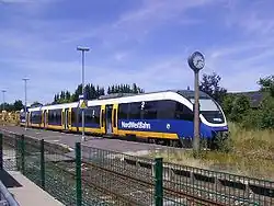 Regionalbahn services on the Senne Railway have been operated by NordWestBahn, which is based in Osnabrück, since 15 December 2003. It uses Bombardier Talent railcars[12] with a maximum design speed of 120 km/h. The average cruising speed is 42 km/h due to the maximum line speed of 60 km/h.