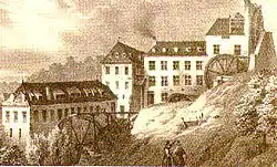 In the late 17th century monks established a paper mill within what is present day Senningen powered by the fast flowing Senninger Brook.[1] Following a fire in 1750, Pierre Bourgeois, a French immigrant, ordered the facilities of the mill enlarged and the residential property on the site rebuilt in the classical style.[1] Output was increased under the ownership of Jacques Lamort throughout the early 1800s, with mechanisation improvements to the mill and the canalisation of the Senninger Brook. However, as a result of economic problems, the mill was finally closed in 1882.[1] The same year, the site was bought by Ernest Derveaux who demolished the mill and transformed the owner's residence into a revival-style castle, Senningen castle, (French: Le château de Senningen), which included neo-Gothic wings, and a landscaped surrounding park with ornamental plants and trees and a lake with a fountain.[1]