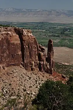 Sentinel Spire is a 5,500-foot-elevation (1,700-meter) sandstone pillar located in Colorado National Monument, in Mesa County of western Colorado, United States.[3] This 200-foot freestanding tower is situated in Wedding Canyon, one-half mile east of the monument's visitor center, and 9 miles (14 km) west of the community of Grand Junction.[5] It is also immediately south of Window Rock, and north of another climbing destination, Pipe Organ, both of which can be seen from viewpoints along Rim Rock Drive. The first ascent of the summit was made May 3, 1960, by Layton Kor, Harvey Carter, and John Auld via the class 5.10 route, Fast Draw.[6][7] This was the day before the climbers also made the first ascent of nearby Kissing Couple. The first solo ascent was made by Ron Olevsky in March 1976, and the first free ascent was made by Andy Petefish and John Christenson in 1978.[8] Some climbers refer to Sentinel Spire as Watusi Spear.[6]
