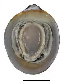 The length of the shell attains 13.1 mm. The shell is symmetrical, cap-like and relatively deep and wide. The outside base color is yellow-brown with a black or purple-pink pattern of triangles and horizontal lines. Inside is white to light gray, septum narrow, and its edge curved and tinged yellow.[3]