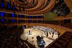 Wide view of a concert with high school choral students and Seraphic Fire singers on stage at the Wertheim Performing Arts Center in Miami.